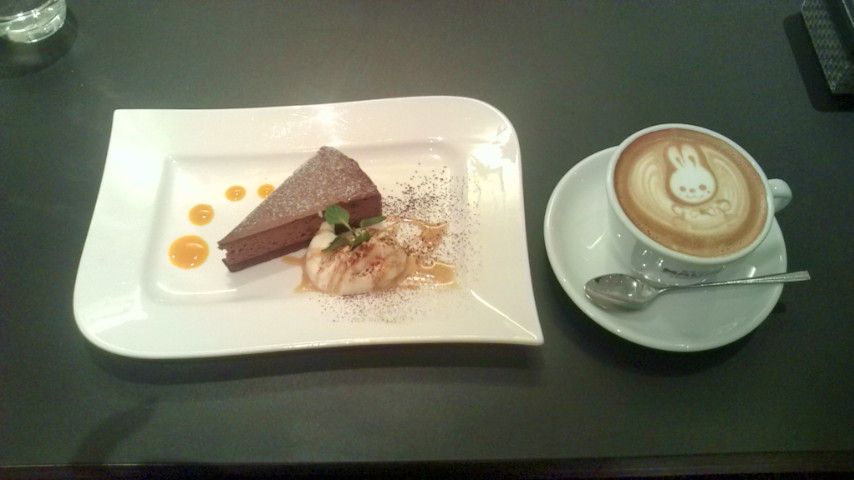 半熟スフレショコラケーキ(だったかな?)。それとカフェラテ。