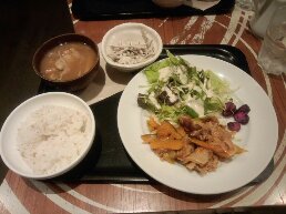 しょうが焼きとサラダ。ごぼうのマヨネーズ和えに、トン汁。ご飯は五穀米でしたよ。