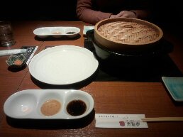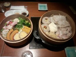 右が、豚さんと鶏さん。(の下にもやしがどっちゃり)と、おこわにシュウマイ。真ん中におぼろ豆腐がいらっしゃいます。