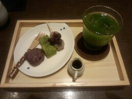 おはぎと抹茶の蕨餅、焼餅に小豆が乗ったやつ。そして飲み物はグリーンティー。