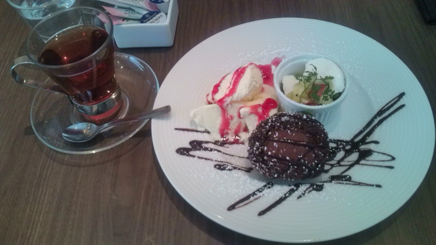 チョコのロールケーキと、横にバニラアイス苺ソースがけ。で、器の中身はミルクババロアりんごとキウイのソースがけ。けっこうなボリュームでした。お供にはやっぱり紅茶。