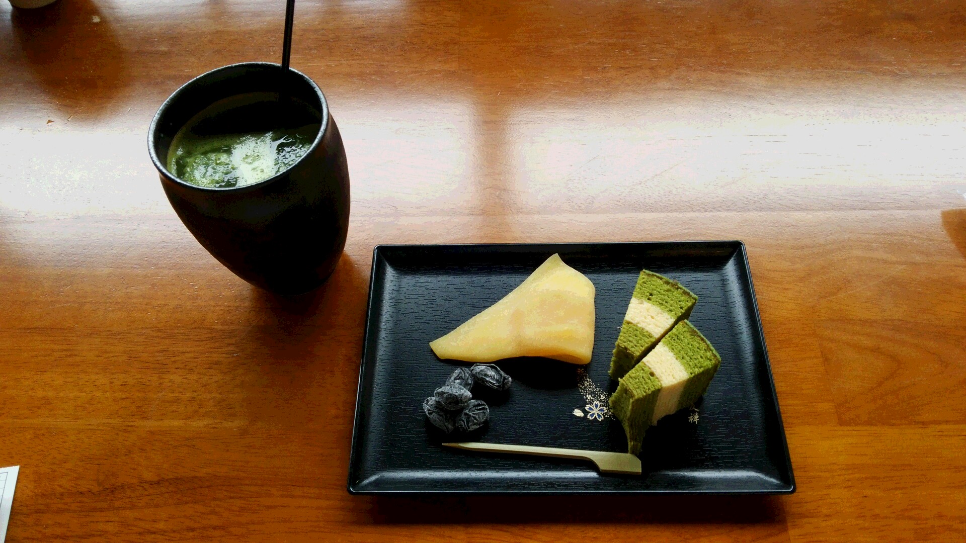 バームクーヘンと八つ橋とお豆さん。そして抹茶ラテ。