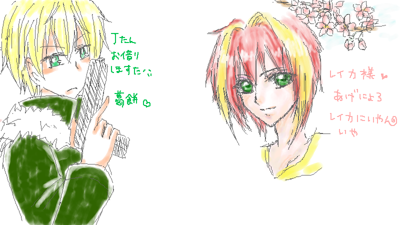 右が鳳蝶ちゃんが描いてくださったうちのレイカ兄さん!!なんとも優しい顔に強い瞳!!美しい……vv