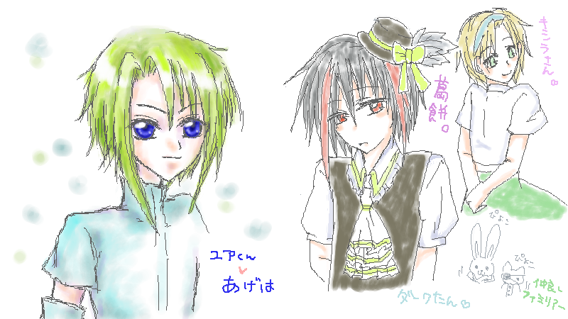 そして右は葛餅作の鳳蝶ちゃん家のダークたんとふぁみりあー。瞼が重くて面倒くさそうな表情してるって、前に聞いてたのでそういうふうに描いたのだけれど………ごめんなさい!!!!しかもあの服。描いてるうちにわけわかんなくなってきたし、学生服のセーターみたいだし。右端には鈴さん宅のキシラさんをお借りしました!!もう二人とも似てなくて申し訳ないです…とほほ。
