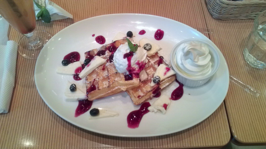 ワッフルの上に乗っかってる生クリームはワッフルに合わせて甘さひかえめで、甘いワッフルとはよい甘さ加減でおいしかったですvv
