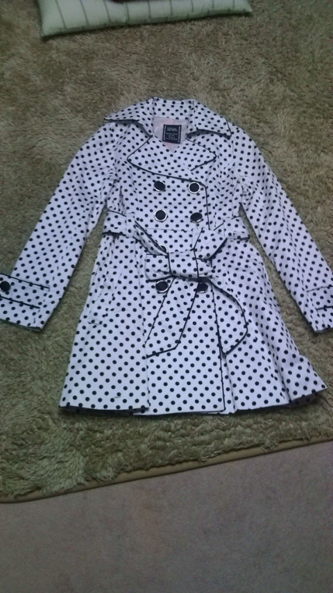 このコートね、黒でドットが白のもあったんですが、これから春になるので、黒は少し重たいかなー、と店員さんと相談した結果、汚れが目立ってしまいますが白色にしました。よいお買い物をした(` ^ ´ )