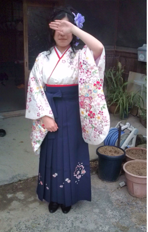 白地に可愛らしいお花がいっぱい刺繍(?)されてて、袴にも花が刺繍されてるの。