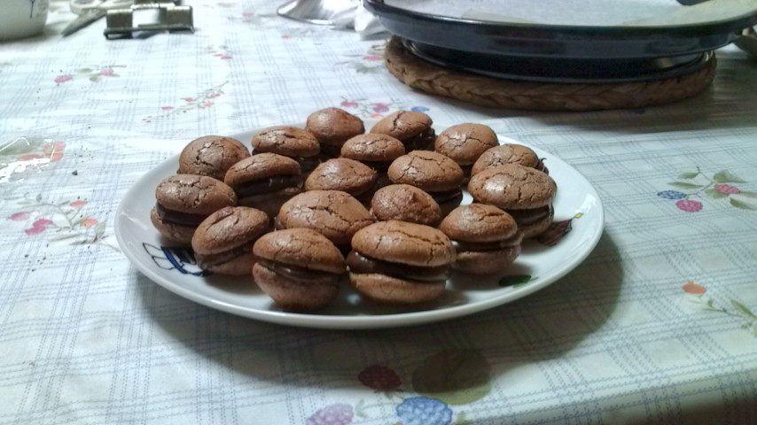 チョコはピンクより簡単なんでね。生地まではどちらも作りが一緒なんですが、ピンクマカロンはサンドするクリームがバタークリームなんです。バタークリームはほんと面倒くさい工程なんで、あんまり作りたくないという……前はバターが固まっていて、時々バターそのまま食べてるっていう失敗作だったので、あれからピンクマカロンは作りたくないというね。