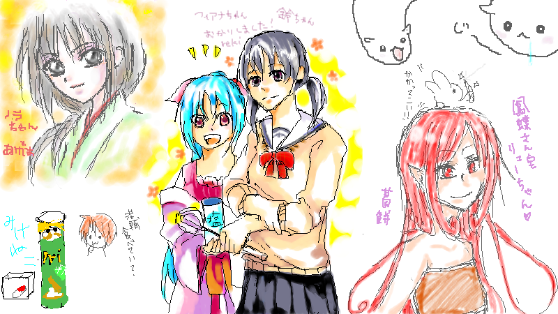 三毛猫さんが来てくれたので四人で画面を分割してお絵かき♪その前に親友が鳳蝶さんのお子様を描いていたのですが、キャプってなかったので画像はありません。鳳蝶さんところのブログに行けば見られるよ!!